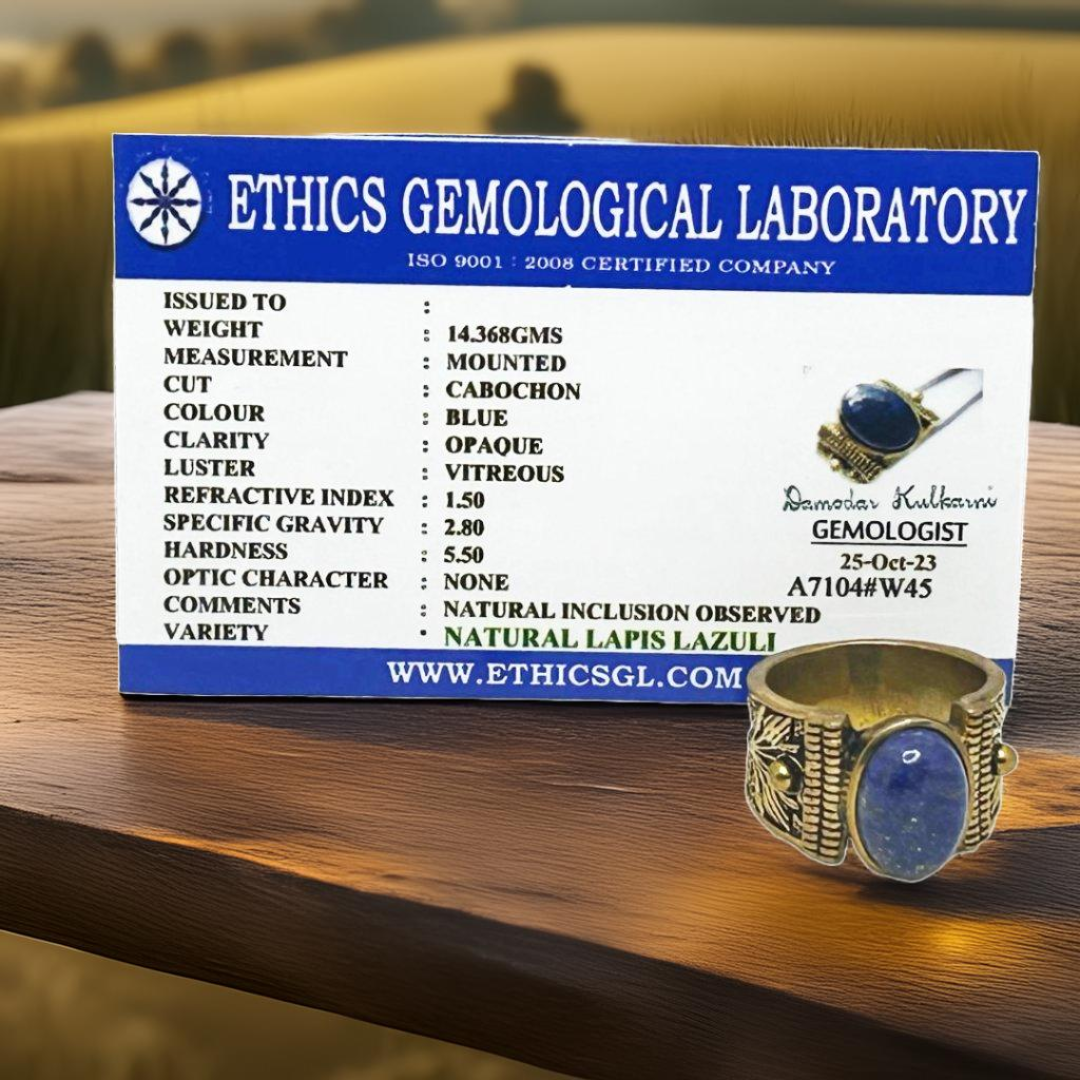 Ye khoobsurat pathar Lapis Lazuli (Urdu mein Lajward) hai. Iska gehra neela rang raat ke aasman ki tarah hai aur isme qudrati taur par maujood Pyrite ke sunehri zarrat aise lagte hain jaise aasman mein taare chamak rahe hon. Ye pathar opaque (gair-shaffaf) hota hai aur iski chamak (luster) bohot decent hoti hai.